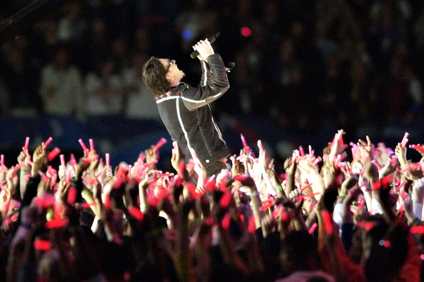 Bono performs amidst a sea of candles at halftime of Super Bowl XXXVI Sunday, Feb. 3, 2002 in New Orleans. The St. Louis Rams are playing the New England Patriots. (AP Photo/Kathy Willens)