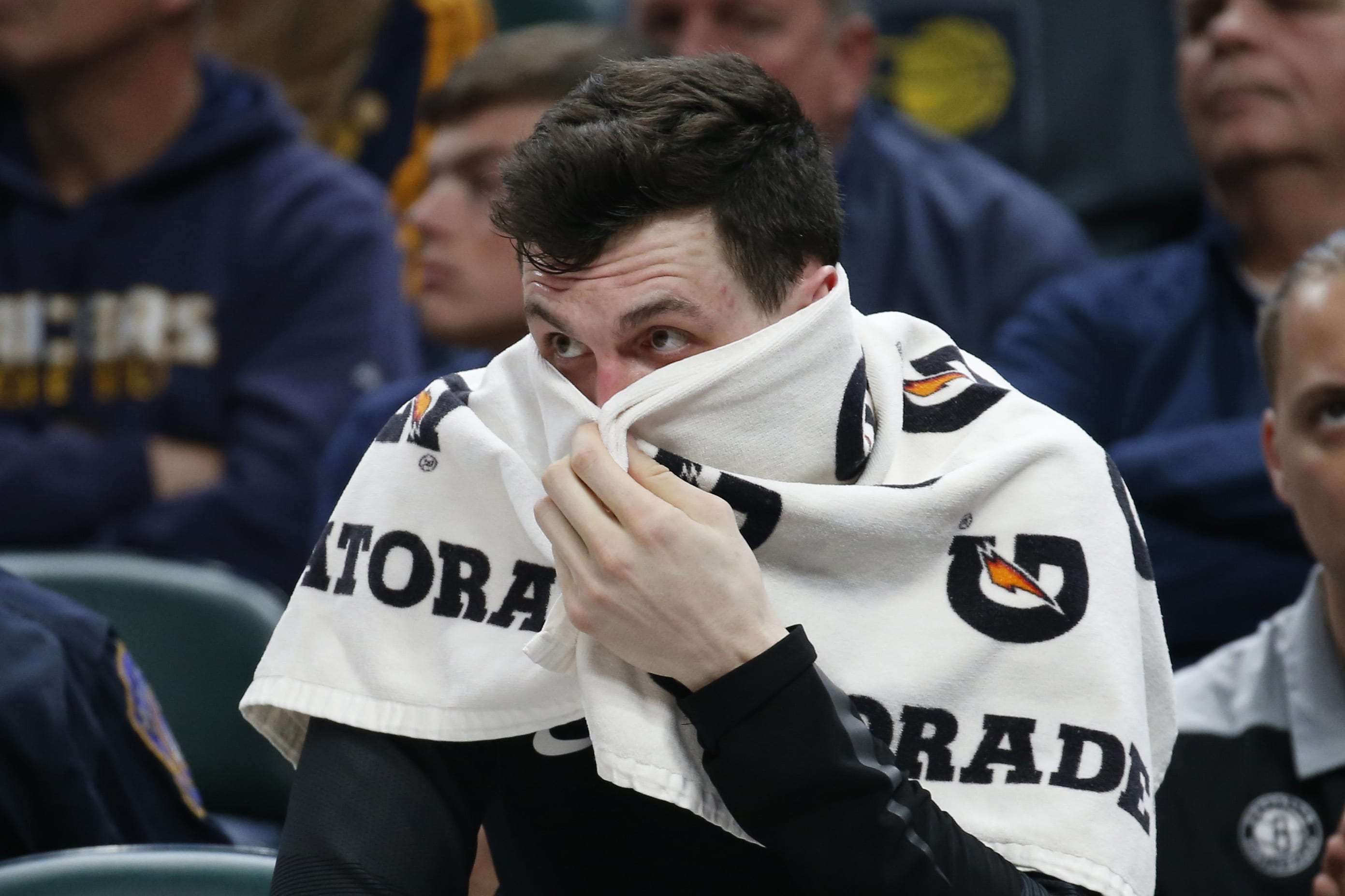 Apr 7, 2019; Indianapolis, IN, USA; Brooklyn Nets guard Joe Harris (12) watches from the bench during the third quarter against the Indiana Pacers at Bankers Life Fieldhouse. Mandatory Credit: Brian Spurlock-USA TODAY Sports