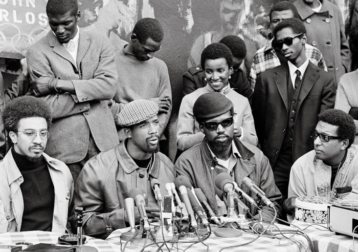Harry Edwards, faculty member of San Jose State College in California, demanded at a Washington news conference, Oct. 24, 1968 an investigation of the U.S. Olympic Committee. Also present from left are: H. Rap Brown, John Carloa, Harry Edwards, Stokely Carmichael. (AP Photo)
